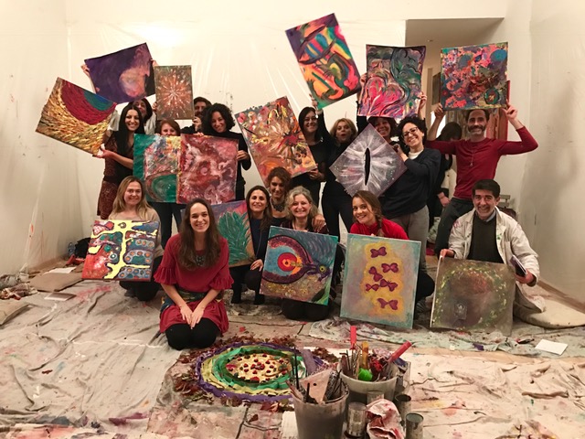 E' sempre emozionante vedere lo spazio trasformarsi grazie alla magia della co-creazione: dal mandala iniziale che preparo in silenzio e solitudine prima del rituale, al centro di uno spazio vergine per passare poi al caos creativo dove pennelli volti braccia e mani si riempiono di colori.